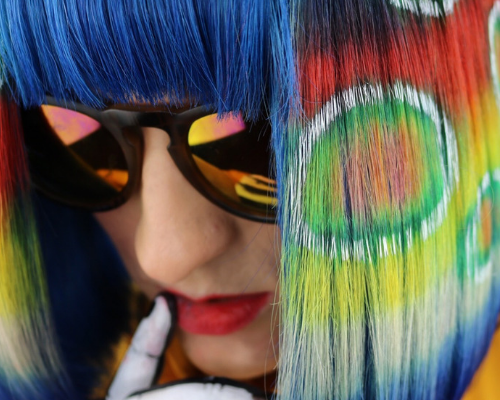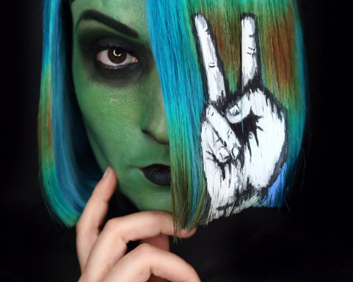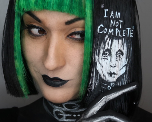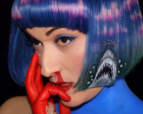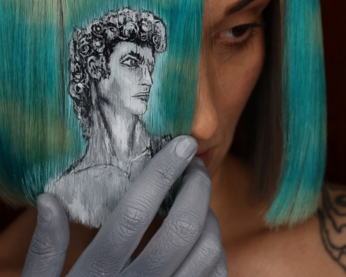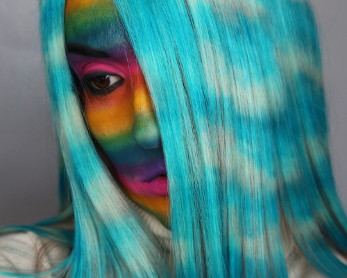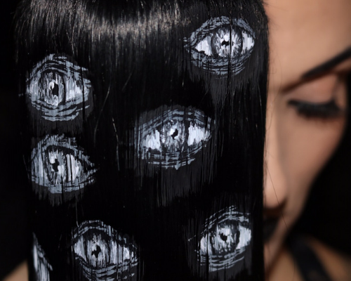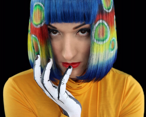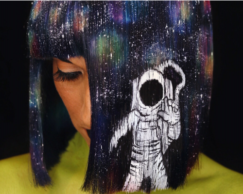 Romano’s hair art can take time, with some pieces taking hours! Romano begins her creative process by coloring hair wefts, followed by washing and drying them. After they are dry she sews them onto a wig cap, then cuts the hair into the style she wants. Then Romano uses Mehron body paint and begins painting her magic freestyle which ends in stunning results!