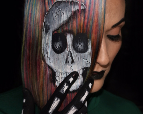 When I asked Romano what got her started with hair art she said ” The image below is actually the very first thing I ever painted on hair! It was late at night, on Christmas Day I believe. It was a make or break moment! I had this idea to paint on hair using body paint and I thought “ok well let’s see if this will actually work or not”! And it did! And the rest is history!